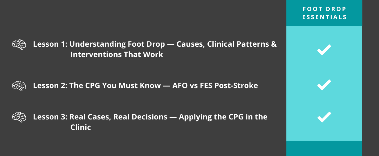 A powerful 3-module training that gives you the clinical reasoning, clarity, and confidence you need to select the right interventions for foot drop based on real impairments, gait deviations, and the latest evidence - including the updated Clinical Practice Guideline (CPG) for AFO & FES post-stroke.
